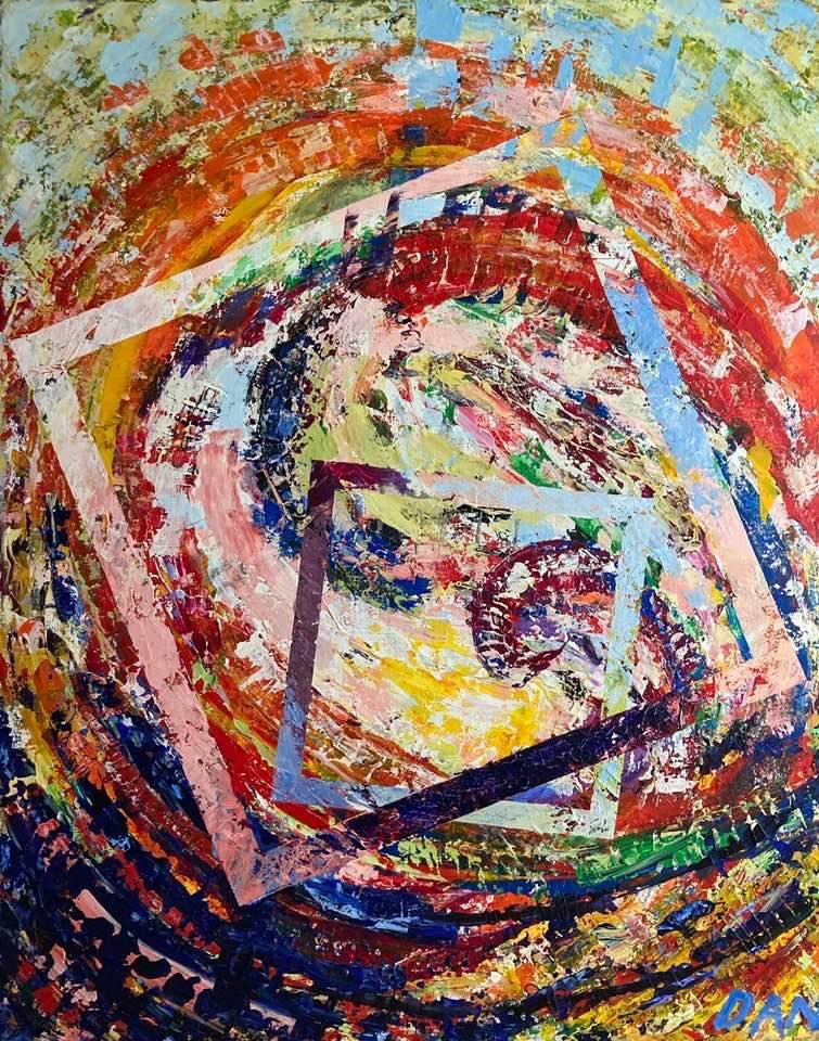 Min process när jag målar börjar vanligtvis med en vag idé. Sedan tar målningen över och leder mig eller kräver justeringar. Driften är min nyfikenhet, jag vill utforska var gränserna går för både färg och form. Hur långt man kan gå och fortfarande få färgen att leva och klinga. Utforska hur formen jobbar ihop med färgerna.